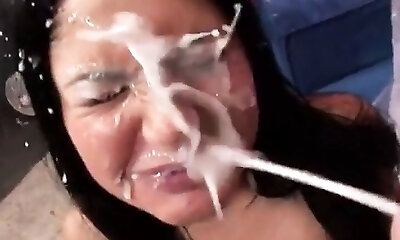 Bukkake. Beautiful Japanese face gets cum drenched by 30 studs