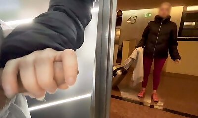 An unknown sporty woman from the hotel gives me a bj in the public elevator and helps me finish spunking