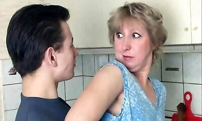 Insatiable, blonde grandma is playing with her tits and her lovers dick, in the kitchen